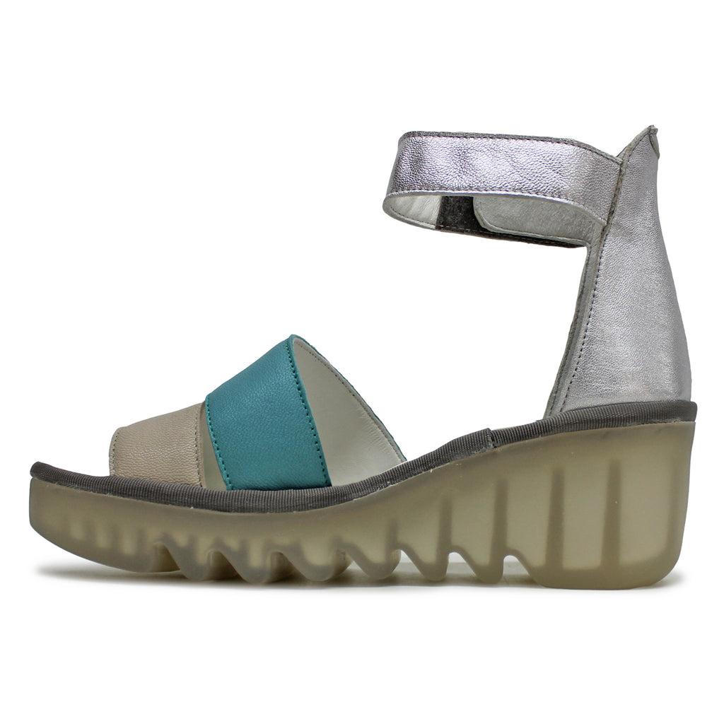 Fly London BONO290FLY Leather Women's Cloud Turquoise Silver Wedge Sole Sandals