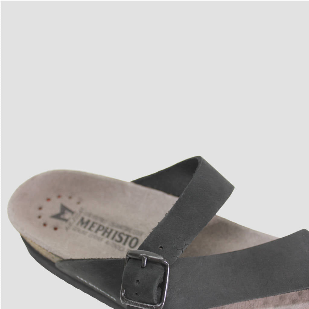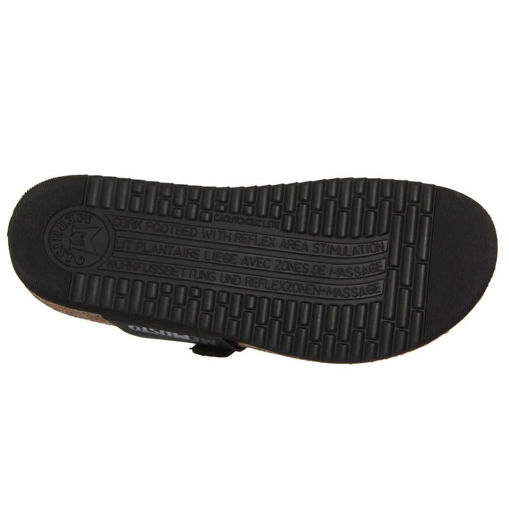 Flat-toe post sandal, Helen from Mephisto offers comfort and good looks with black leather upper. Handcrafted out of top grain aniline dyed leather. Process which secures intensity of colour, preserves softness and elasticity of leather and its natural texture. Matching sole and black buckle catch the eye. Top quality summer toe-post have adjustable, buckle closure and leather lining. Backless footwear is breathable and moulds to shape of the foot. All day comfort sandals contain Soft Air Technology midsole, it absorbs shock and protects feet from impact, reliving joints, spine and vertebrae. Air Relax, leather covered, cork footbed stimulates reflex area and secures all day cushioning. Durable slides use natural rubber and cork, they are free of chemicals. Rubber sole prevents slippage and makes this footwear long lasting.